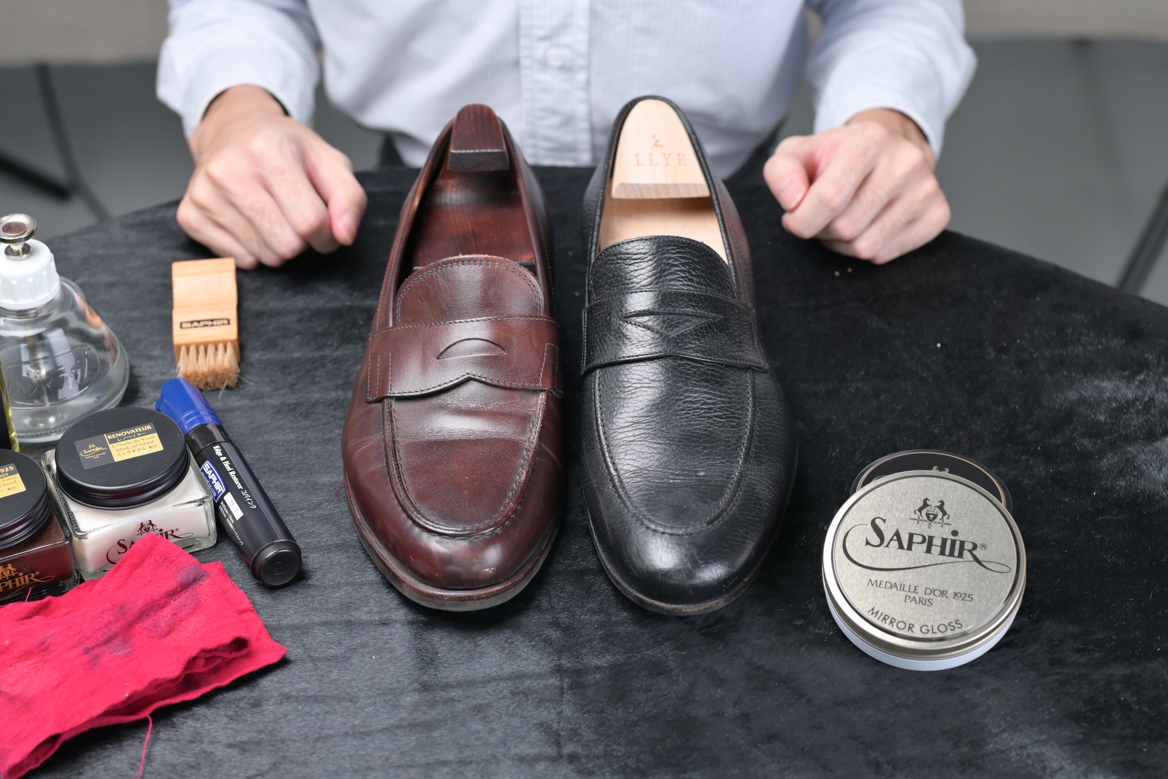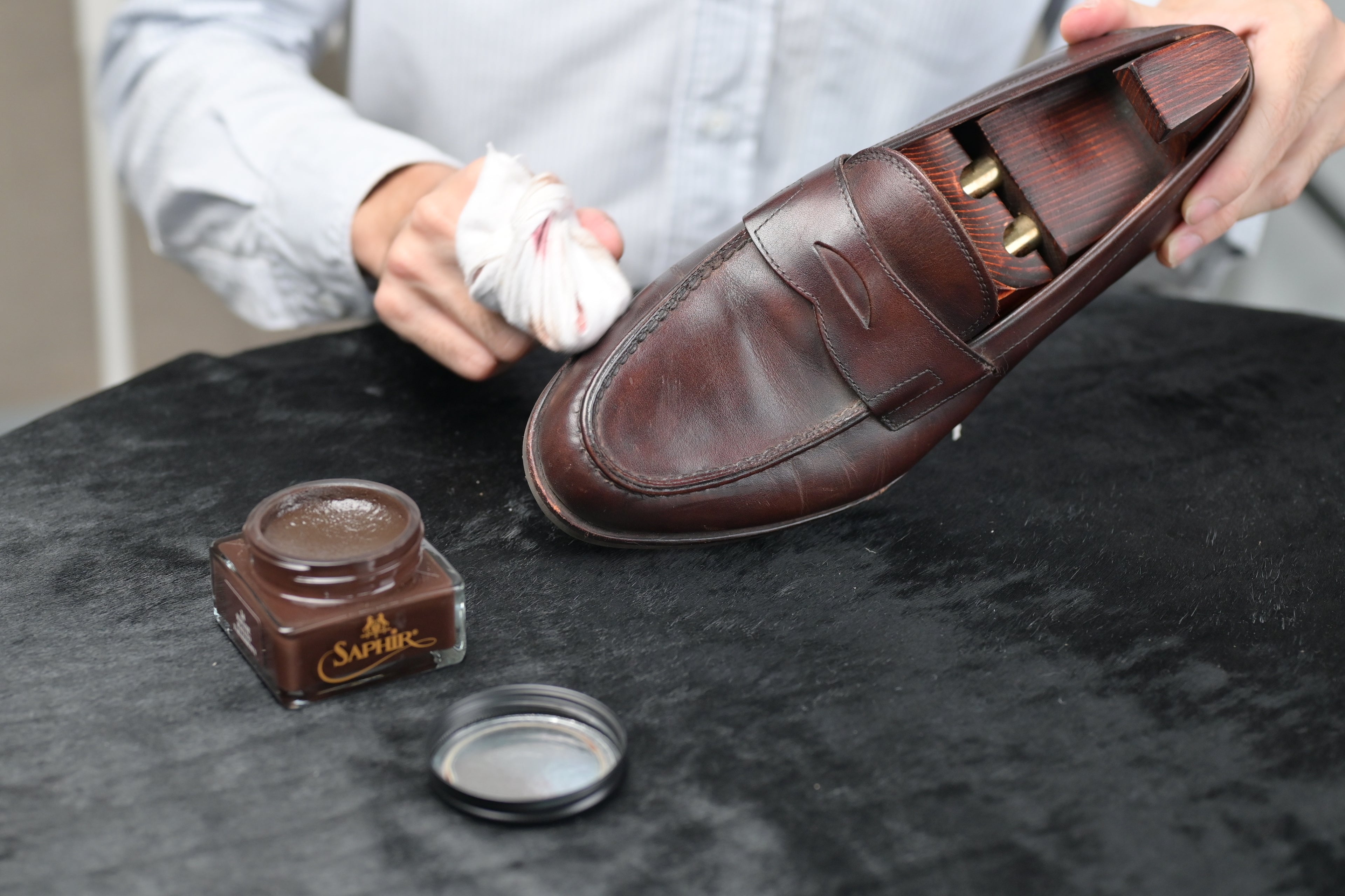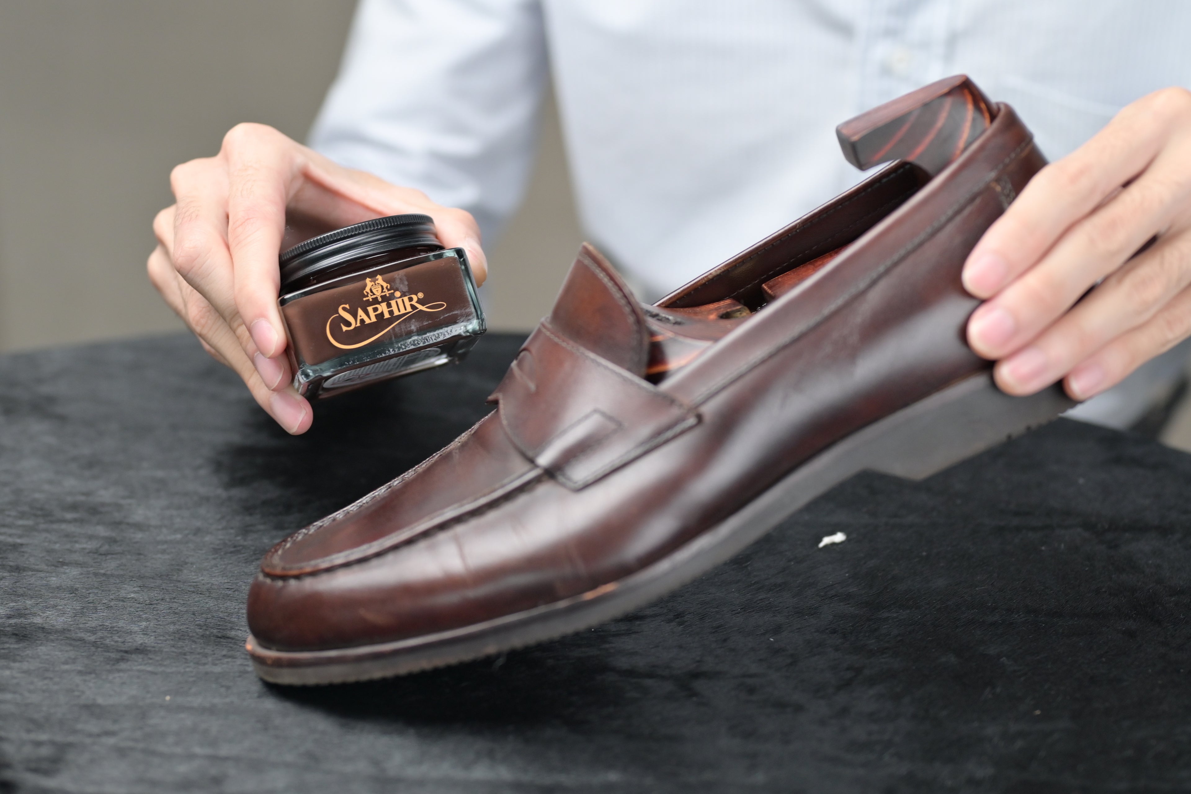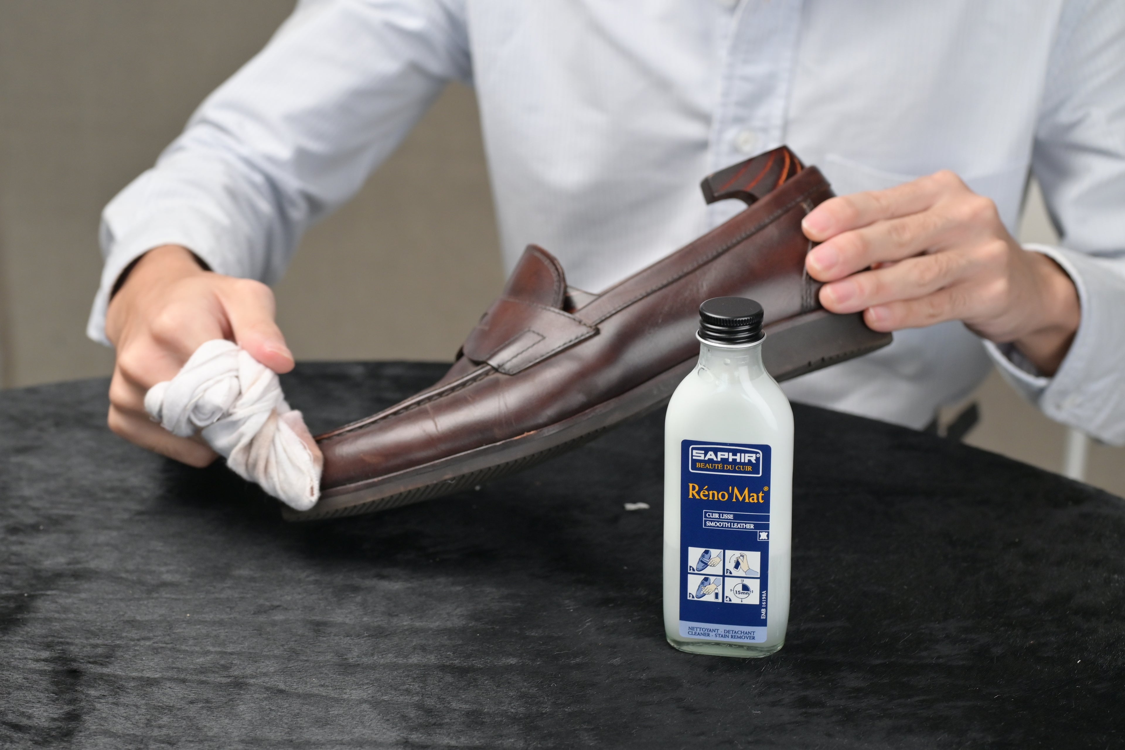 We recommend using Saphir’s Renomat to thoroughly clean the shoes in order to remove the old layers of cream and wax polish applied previously. This helps to open the pores of the leather, allowing the nourishing creams and waxes to be absorbed by the leather in the later stages.