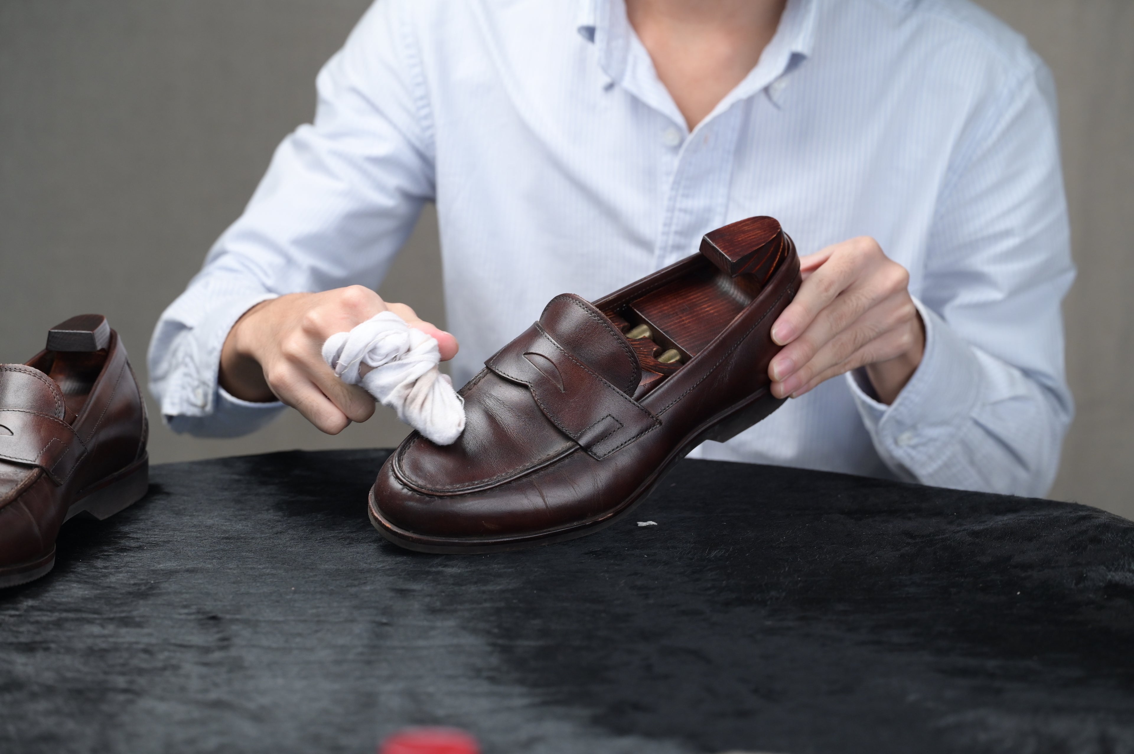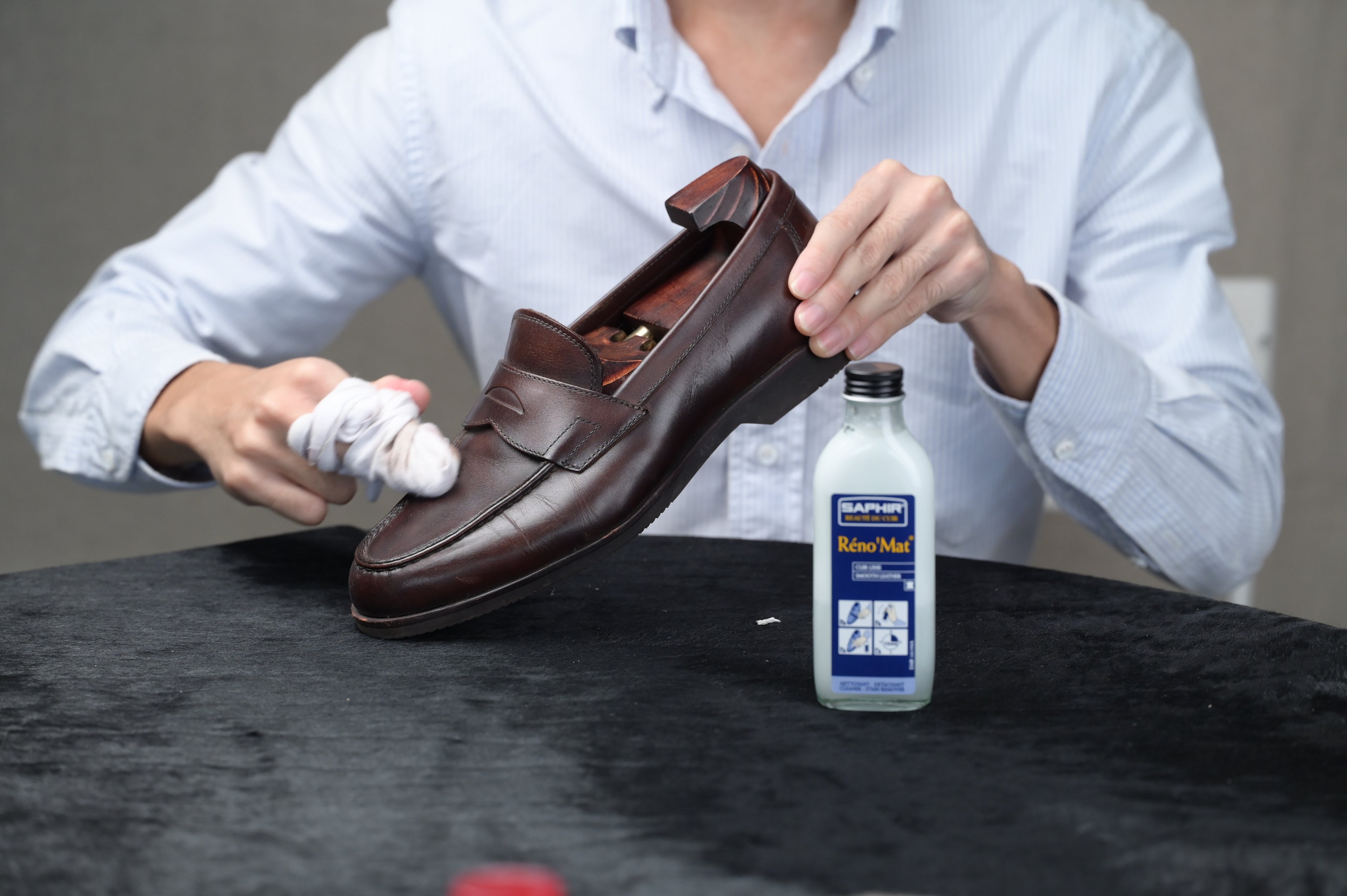 With a cotton cloth wrapped tightly around your first two fingers, apply a coin-sized amount of the Renomat onto the shoes. Change to a clean part of the cotton cloth when it starts to gets dirty and repeat the application until you notice the shoes’ microscopic pores start to open. When the leather returns to its bare state, allow the shoes to dry and rest for about 10 minutes.