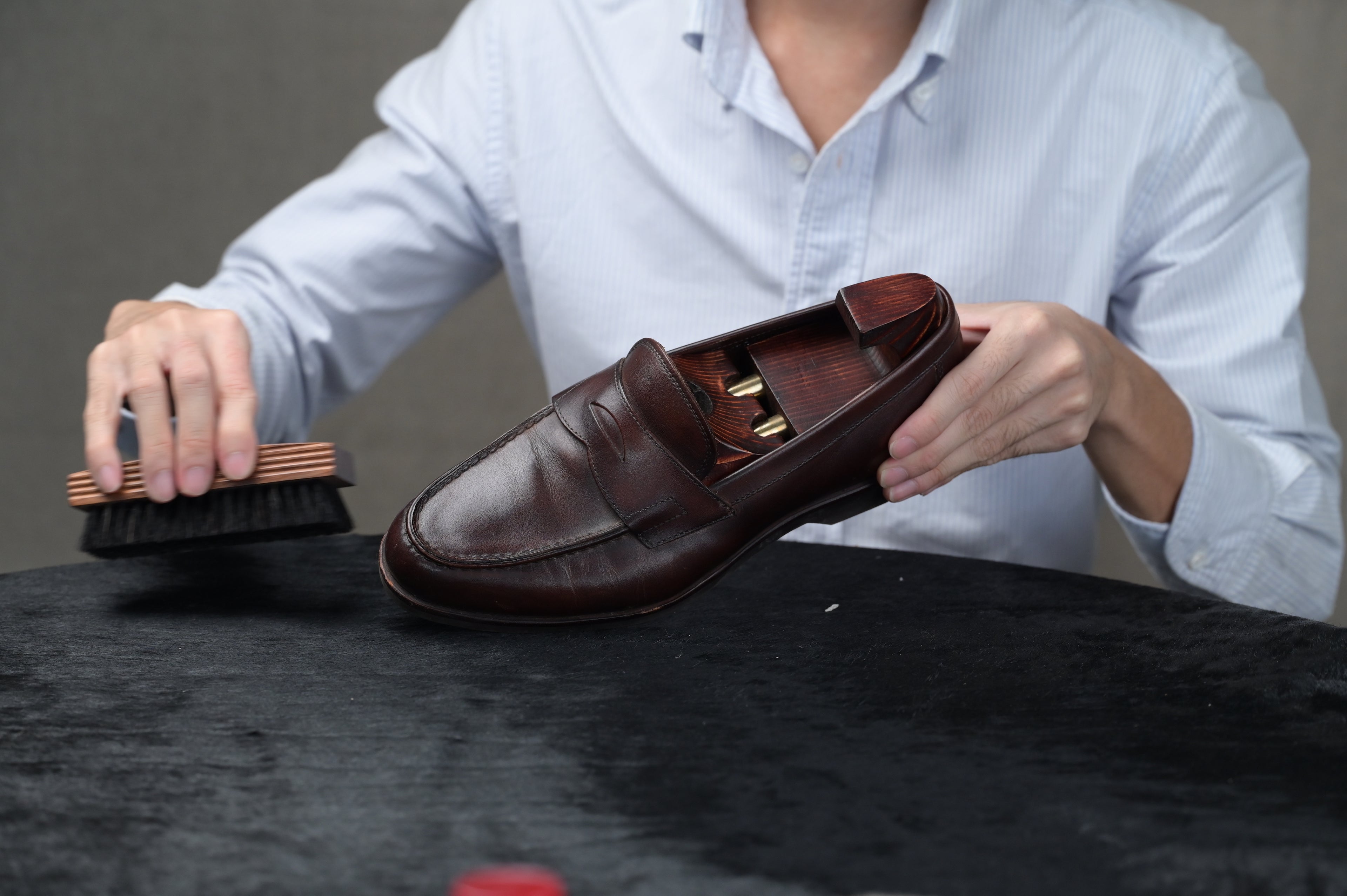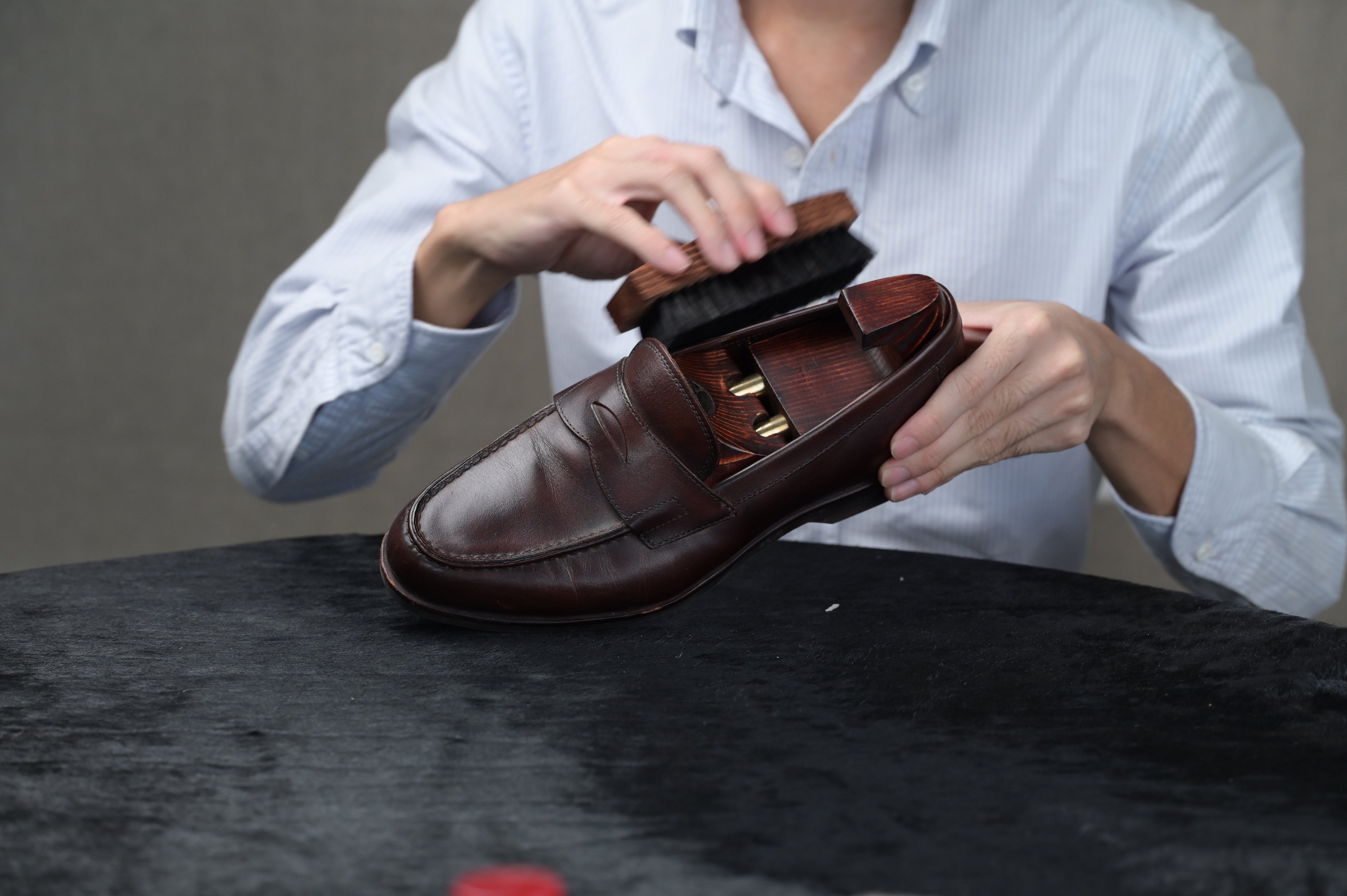 It is important to brush the shoes with a boar hair brush to push the shoe cream into the pores of the leather. This is to ensure the cream is permeated and absorbed well into the leather.