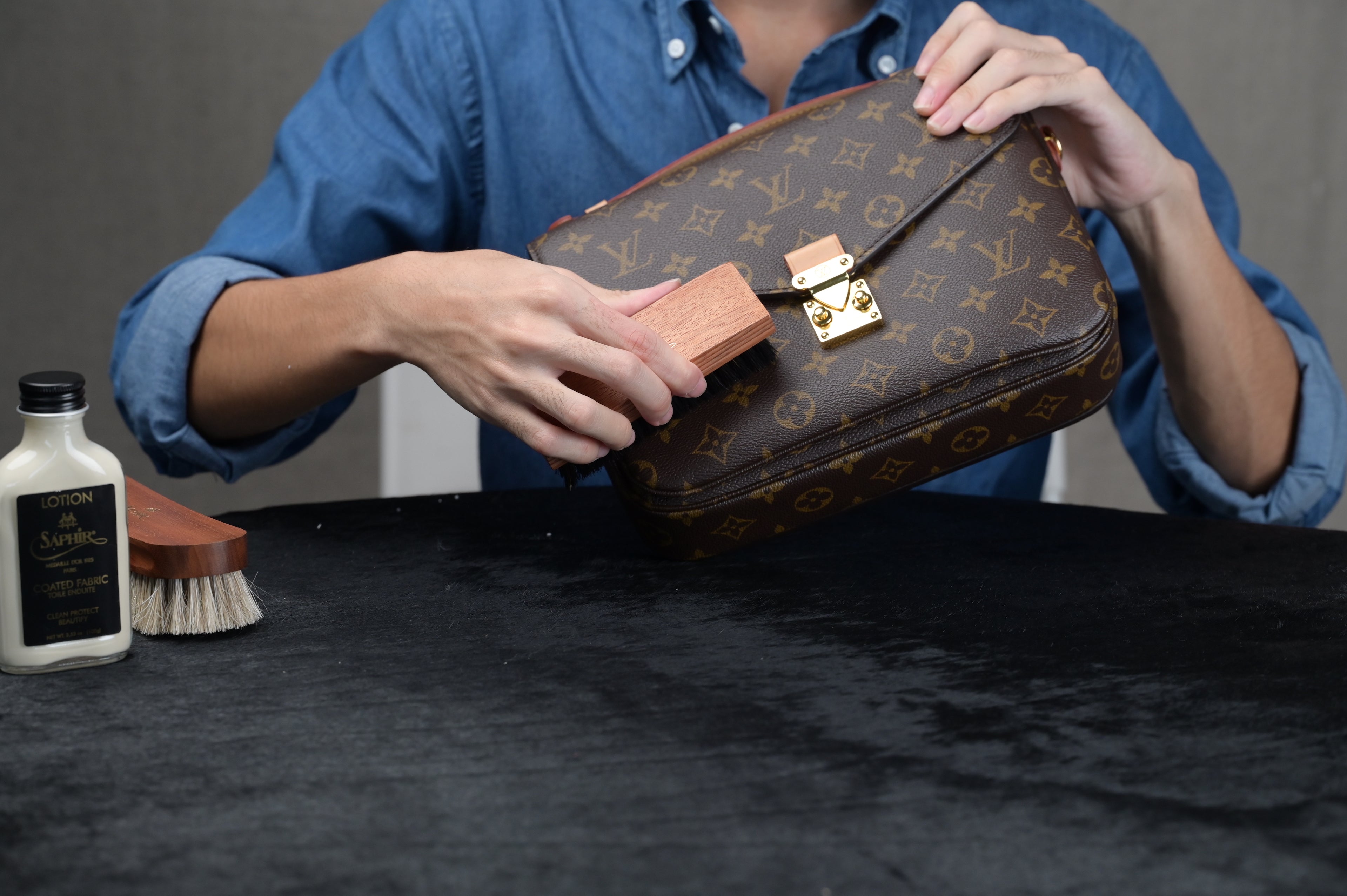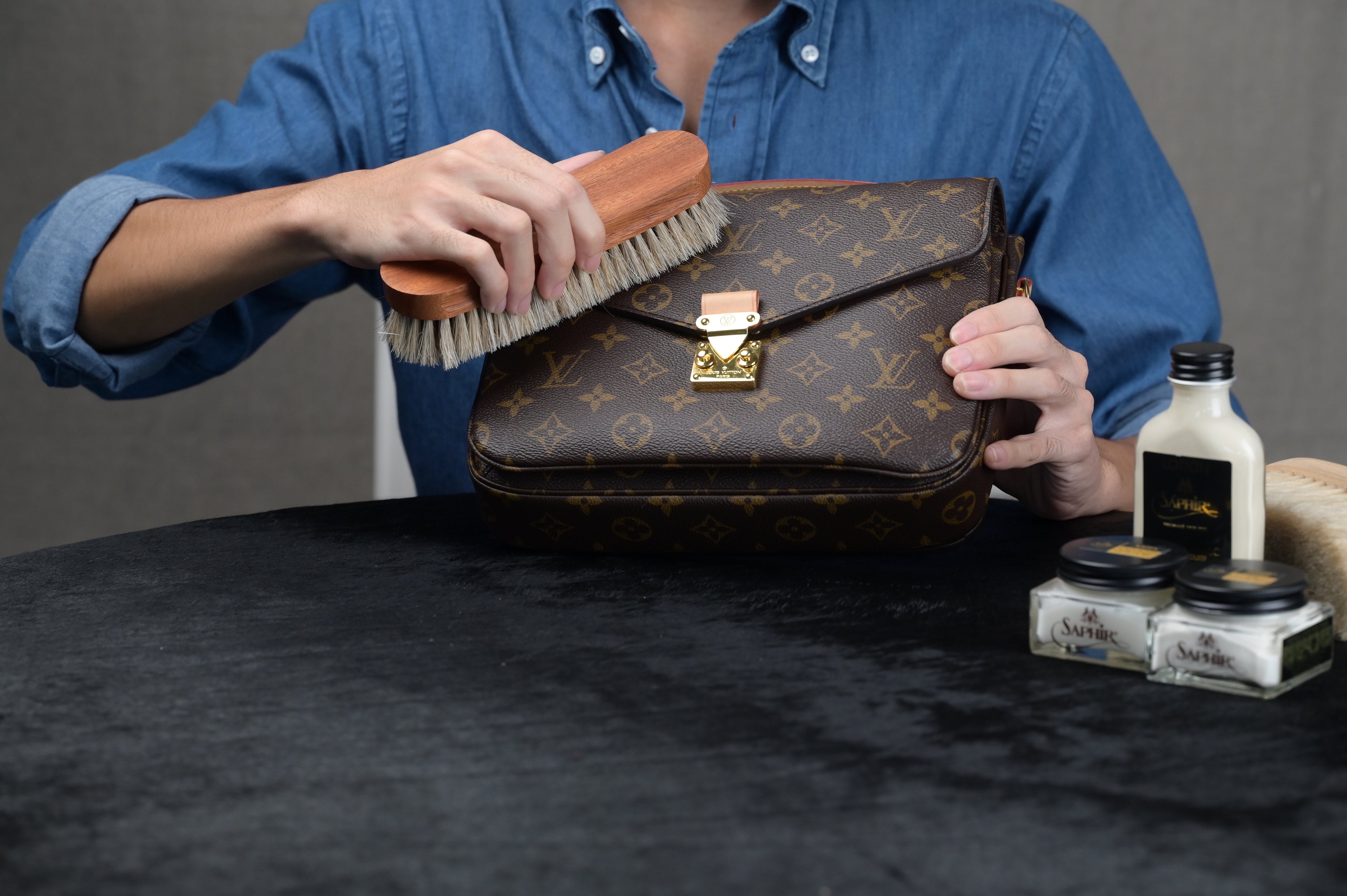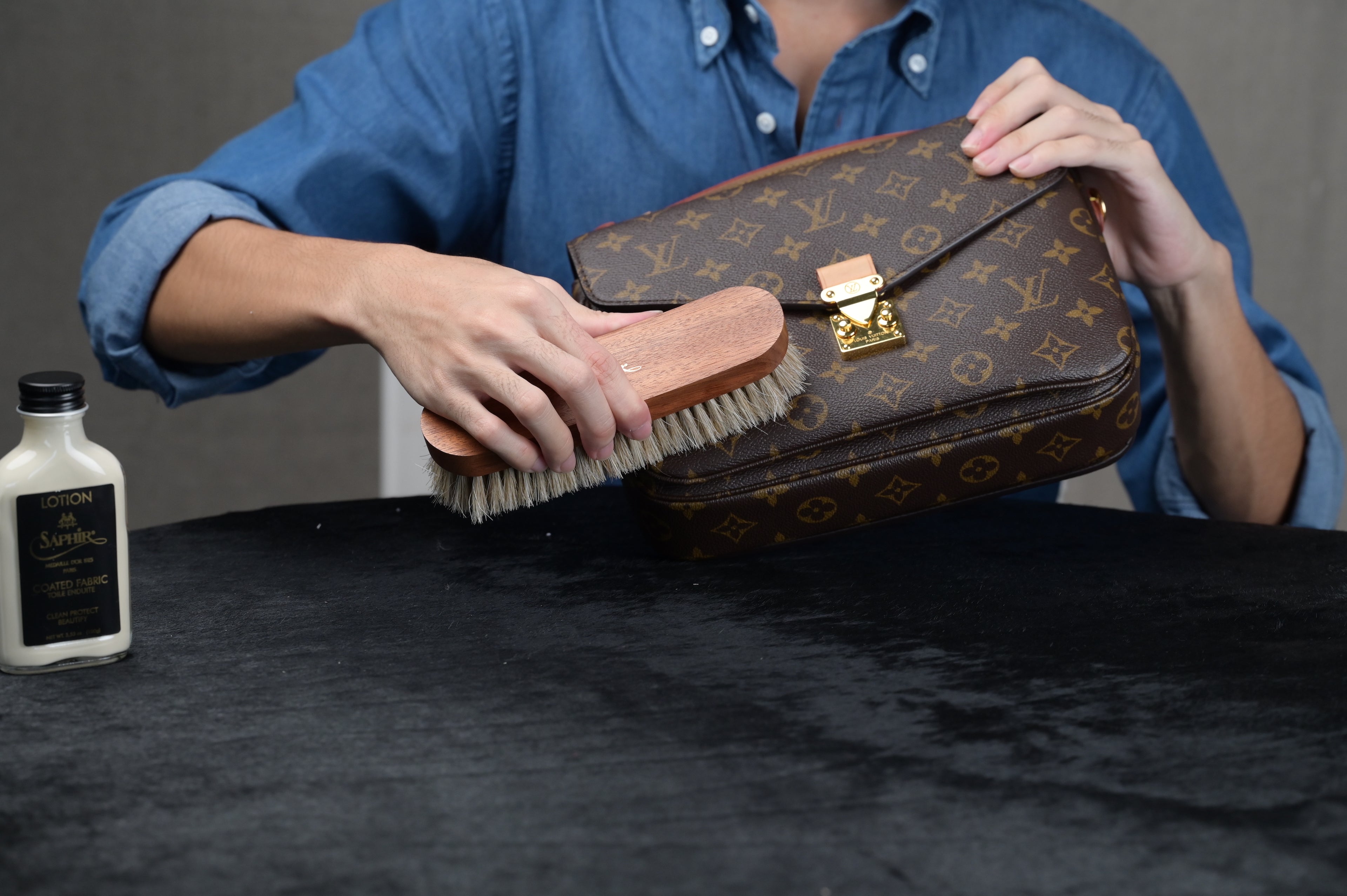 Just like your leather shoes, bags also need to be prepared first before proceeding with any form of restoration or treatment. To begin, brush off any superficial dust on your coated fabric bag using a horsehair brush. Hold the brush firmly and brush in a ‘back-and-forth’ motion over the entire bag.