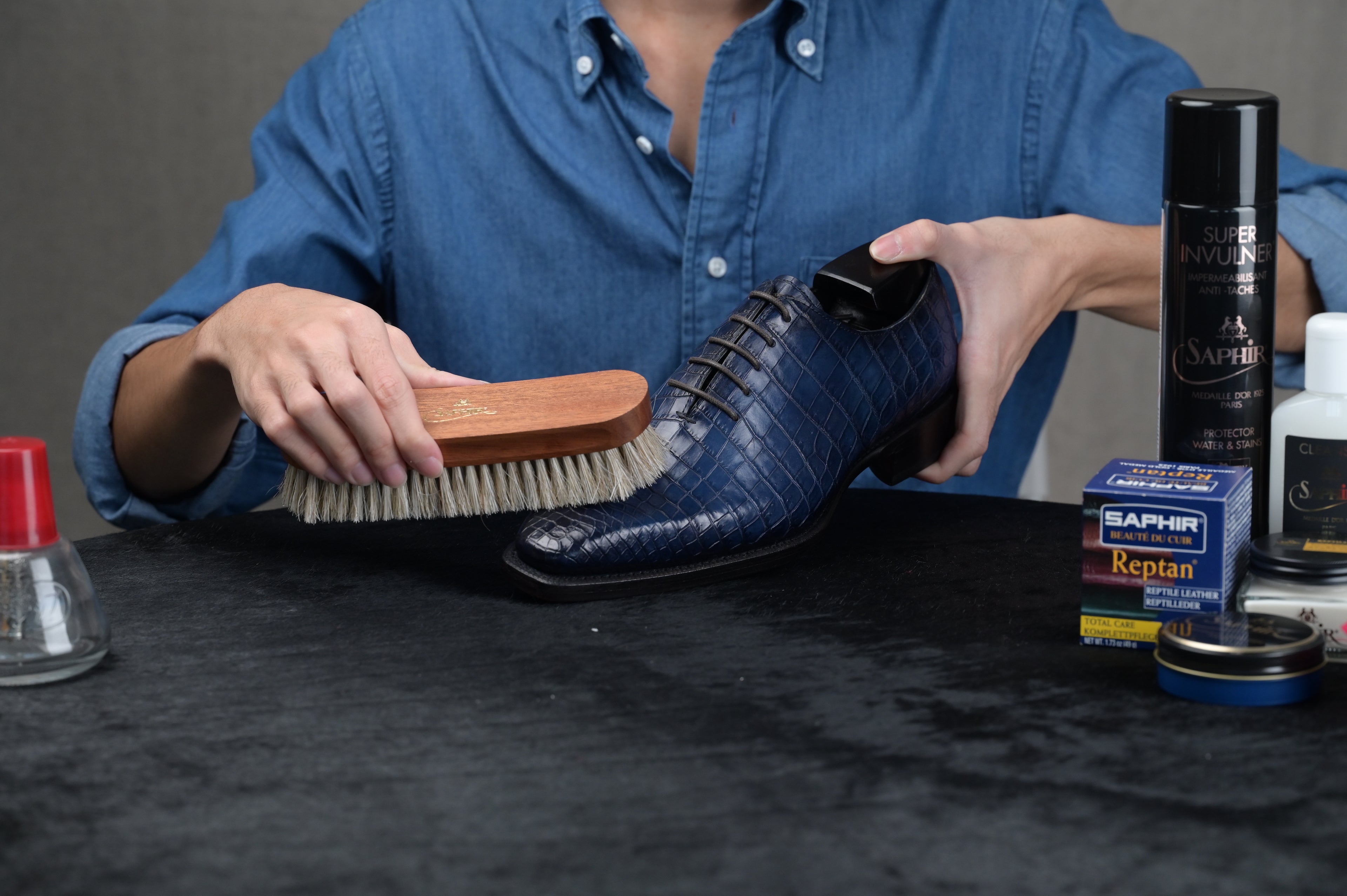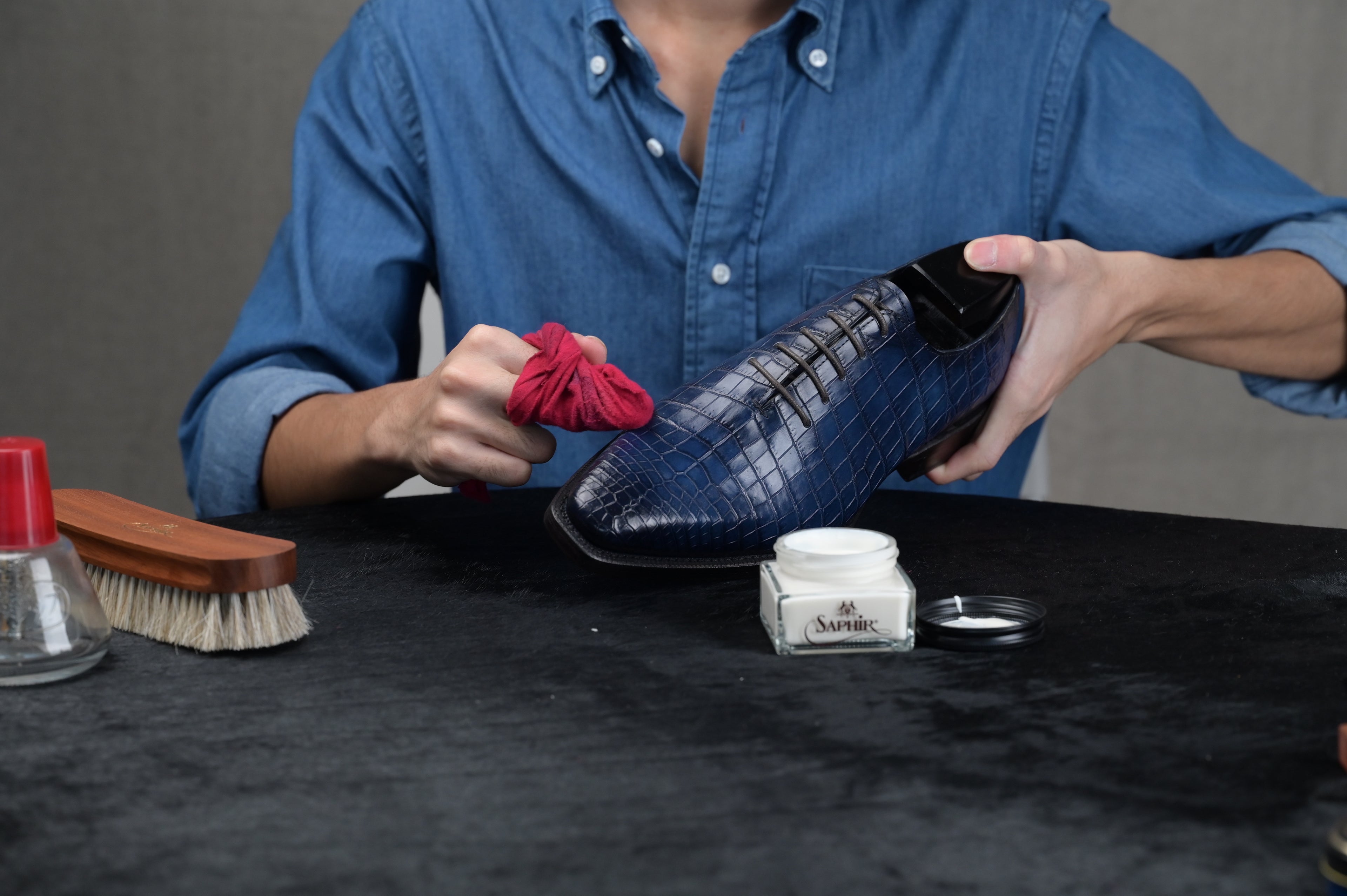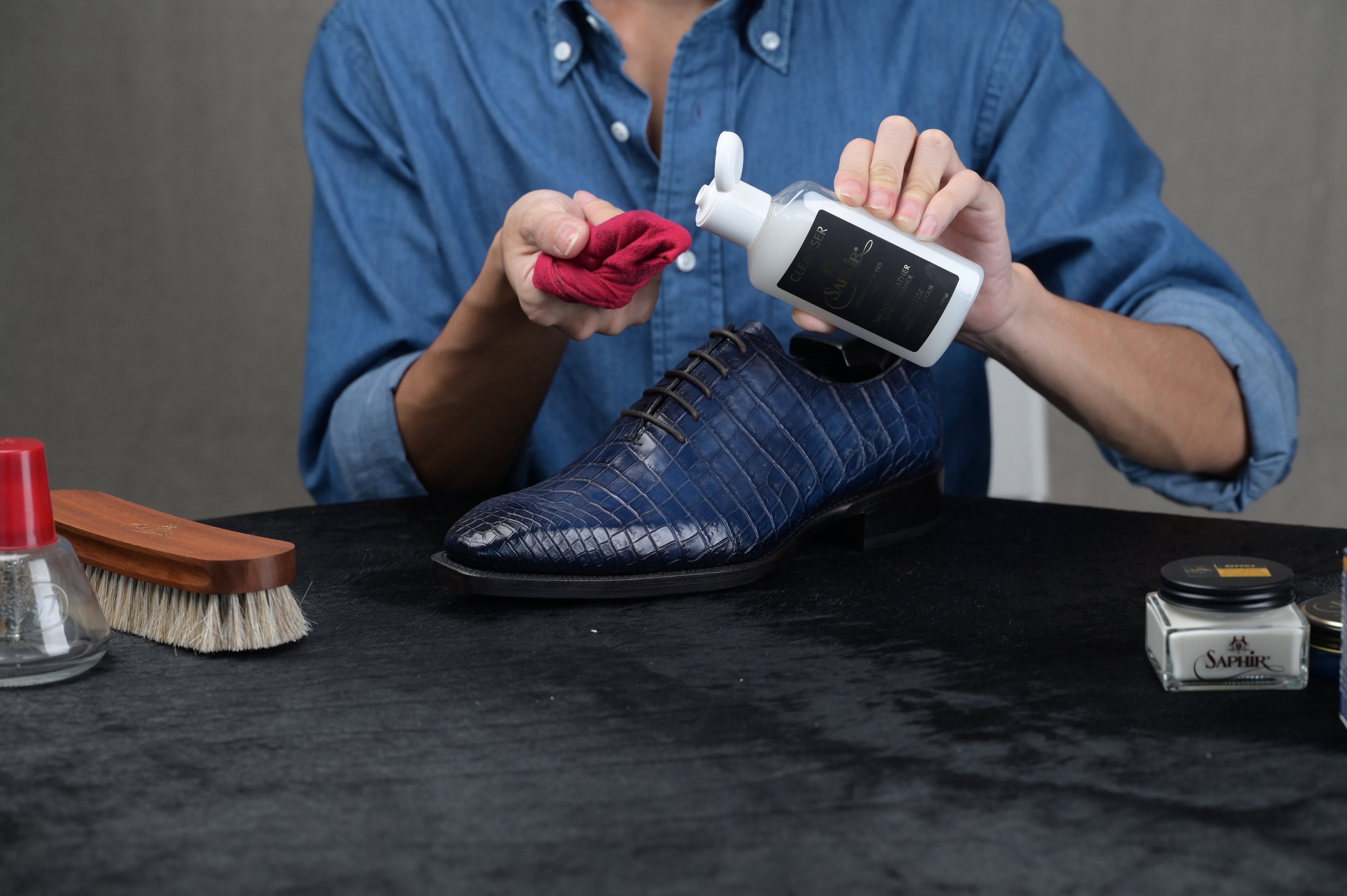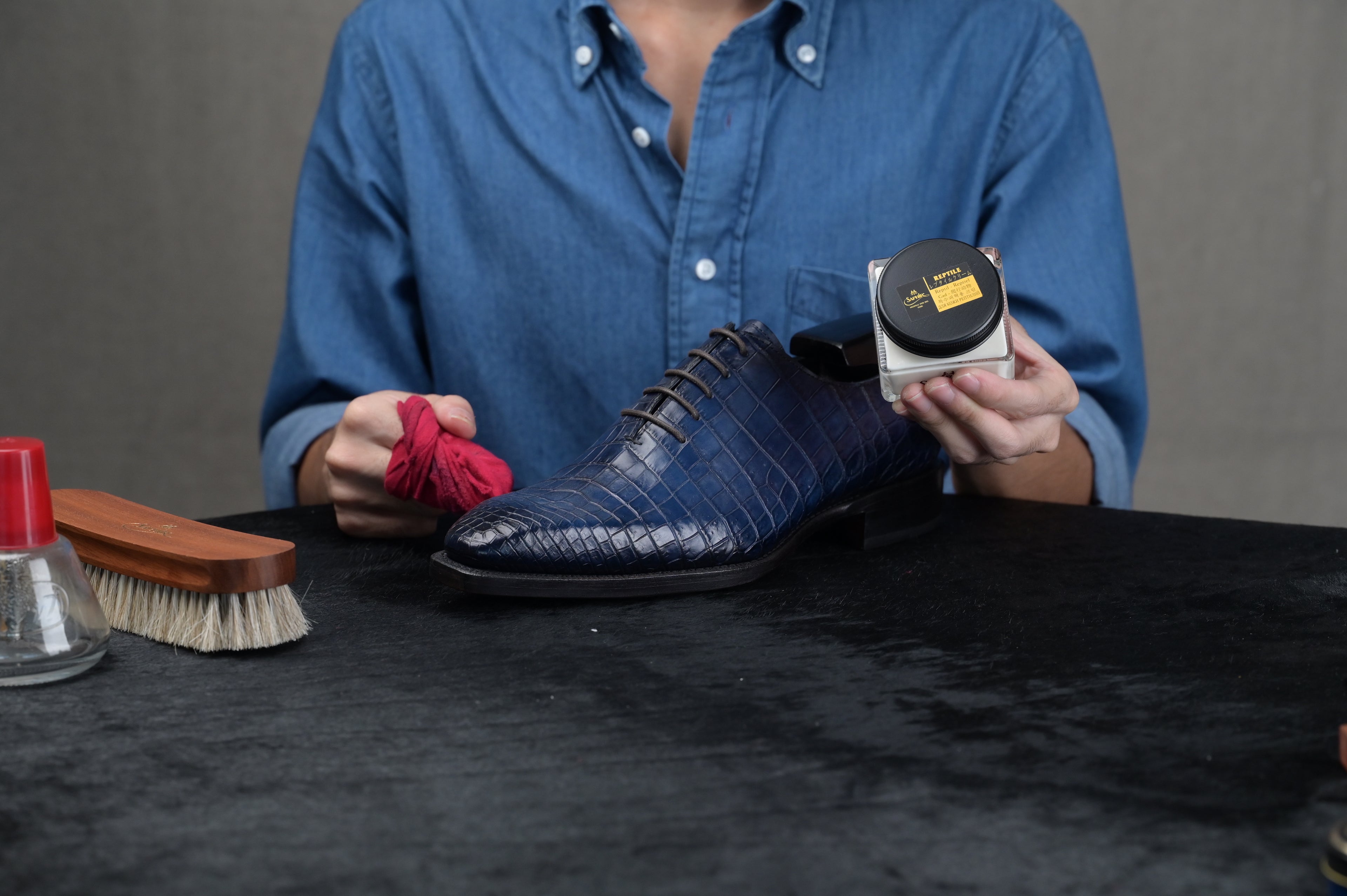 Exotic leather like crocodile or alligator skins are generally very durable, but they do require regular conditioning in order to prevent them from drying out and having their scales crack. You can either use the Saphir Beauté du Cuir Reptan or Saphir Médaille d'Or Reptile Cream to deeply nourish these leathers.