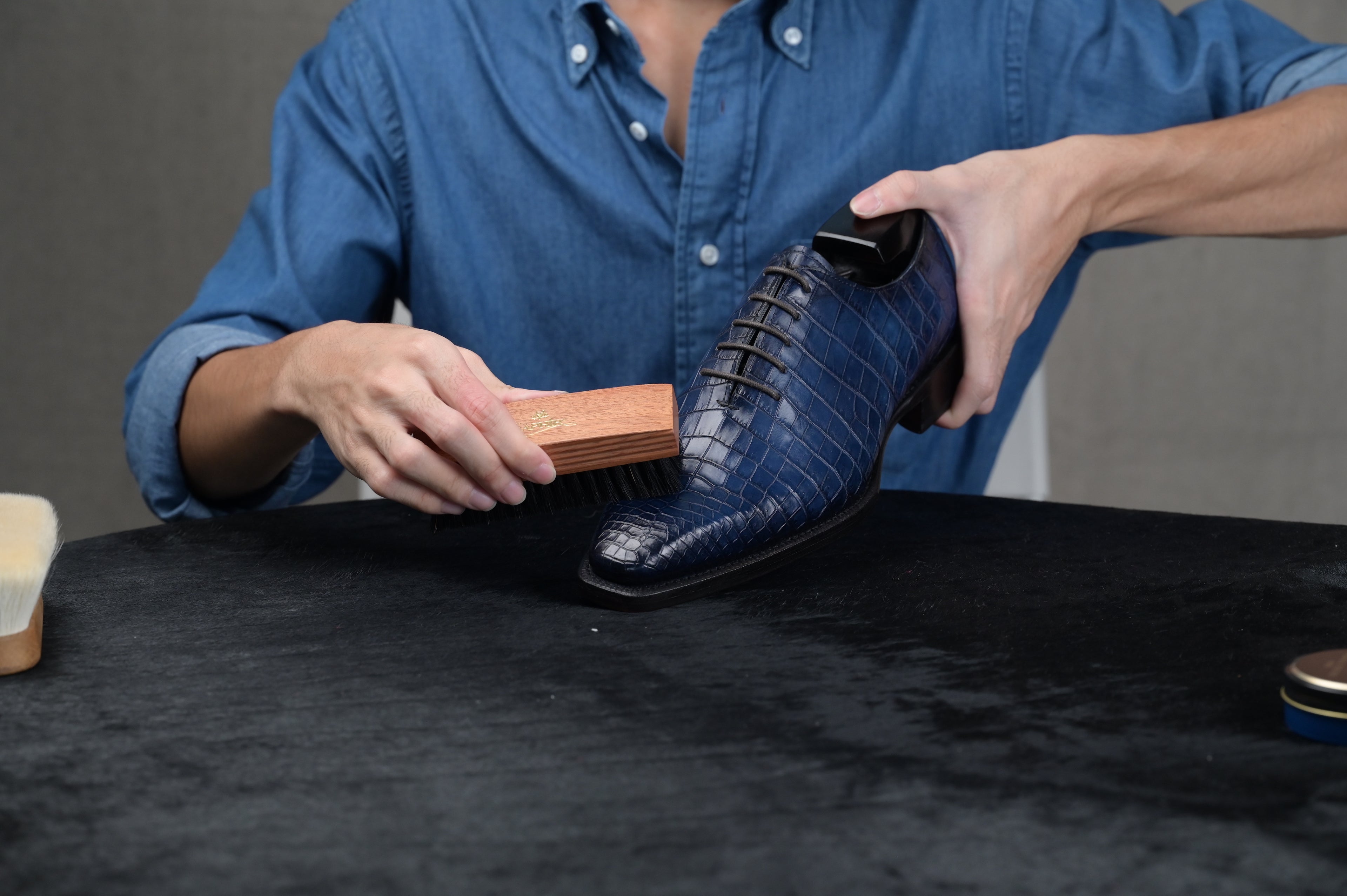 It is important to brush the shoes with a boar hair brush to push the shoe cream into the pores of the leather. This is to ensure the cream is permeated and absorbed well into the leather.