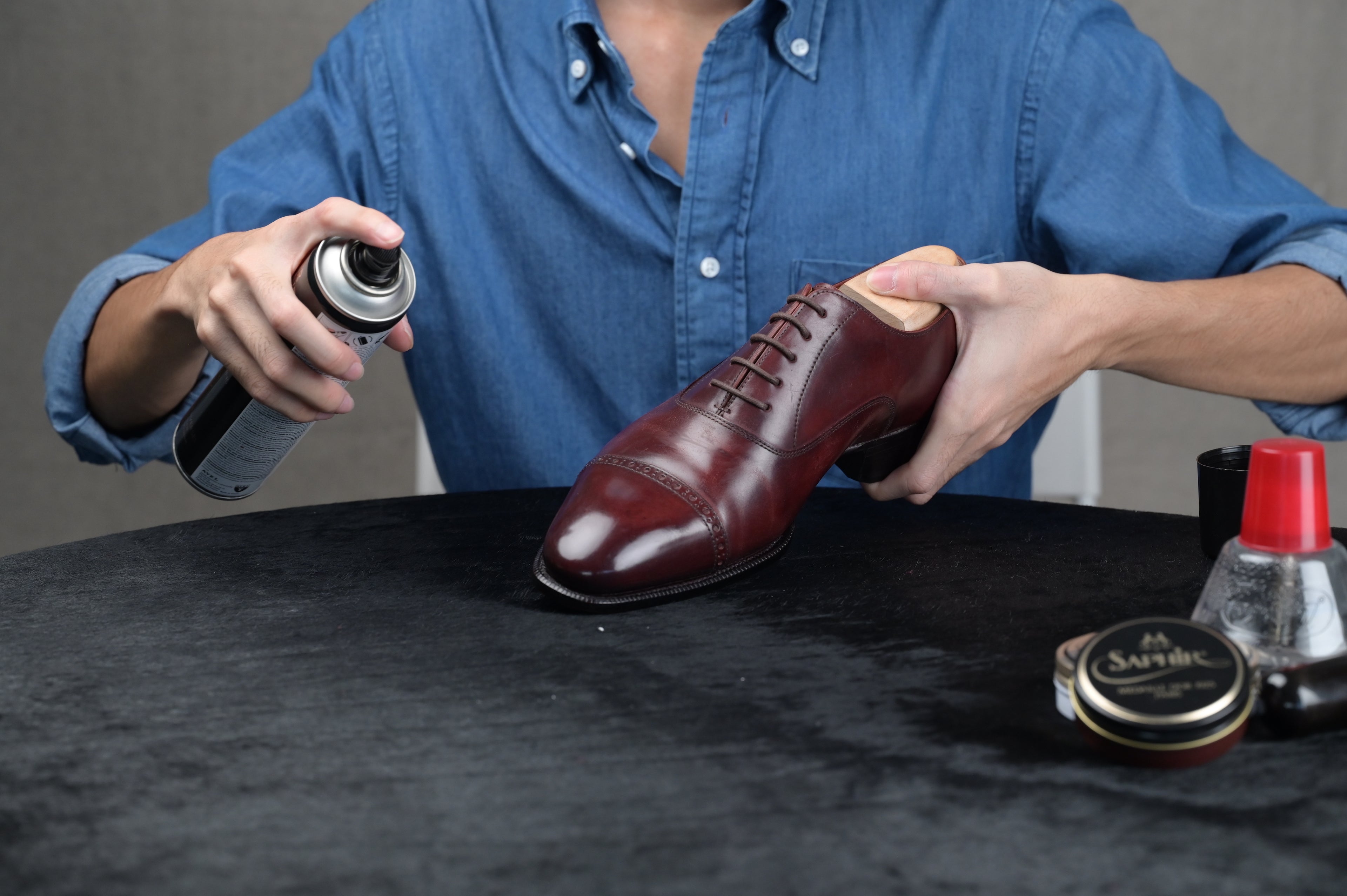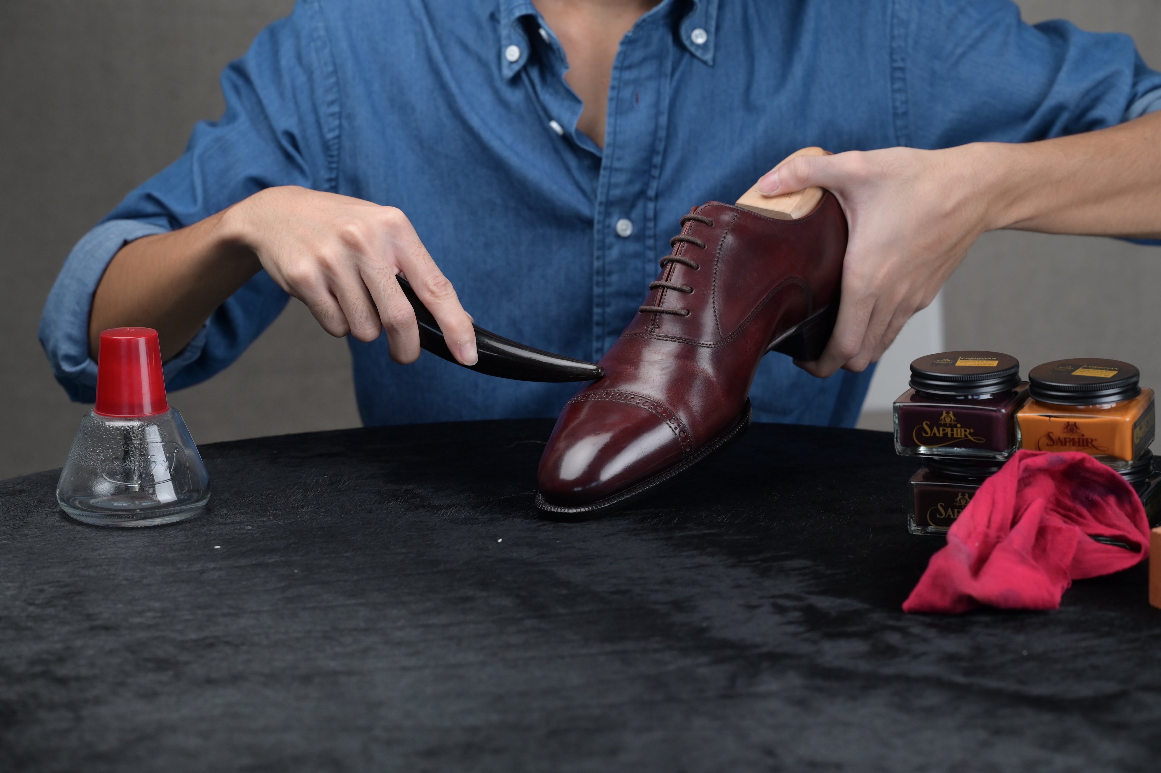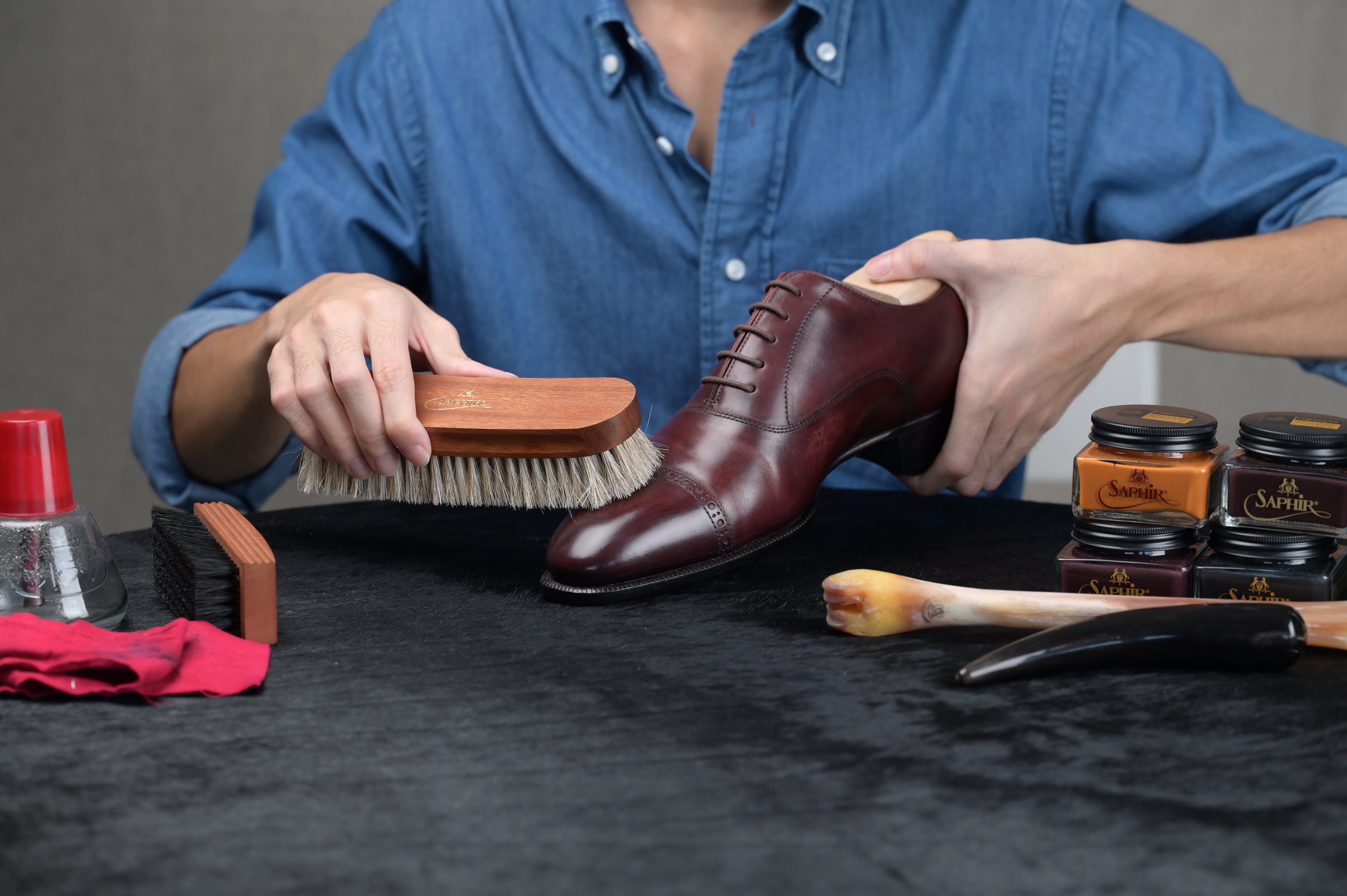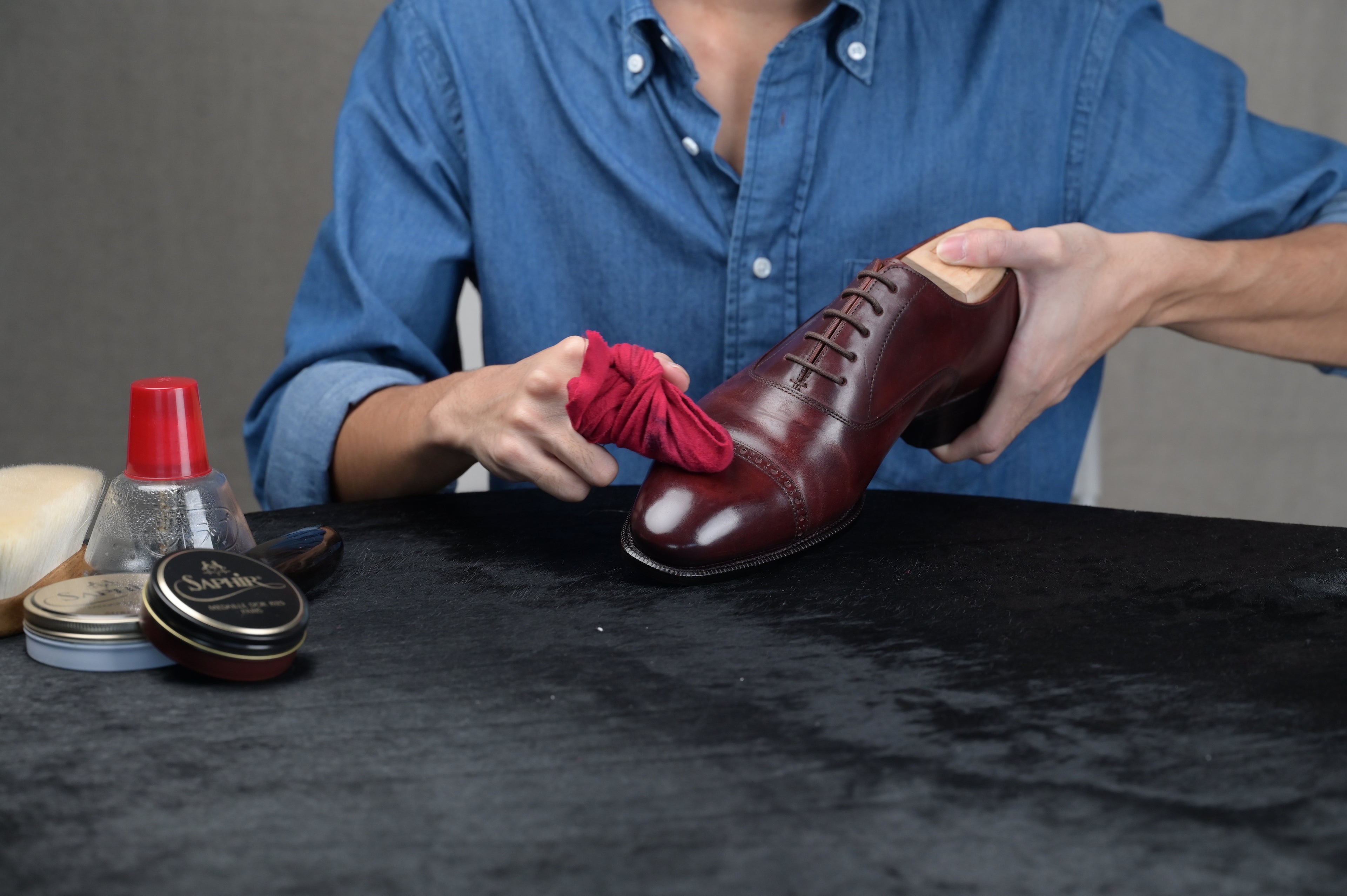 The final step of the shoe shining process is to smoothen out the surface of the wax layer and remove any faint traces with just water.
