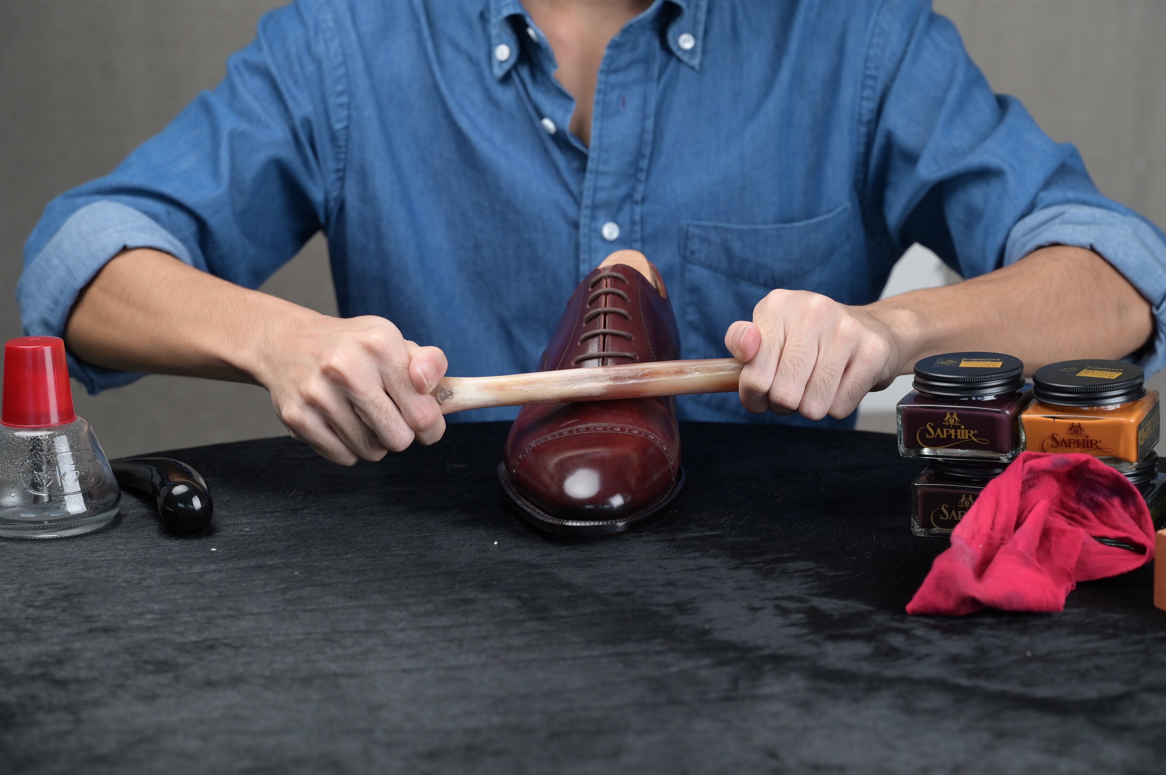 After cleaning the shoes, you can either use a deer polishing bone or an ebony stick to smoothen out and expand the creases on the cordovan shoes.