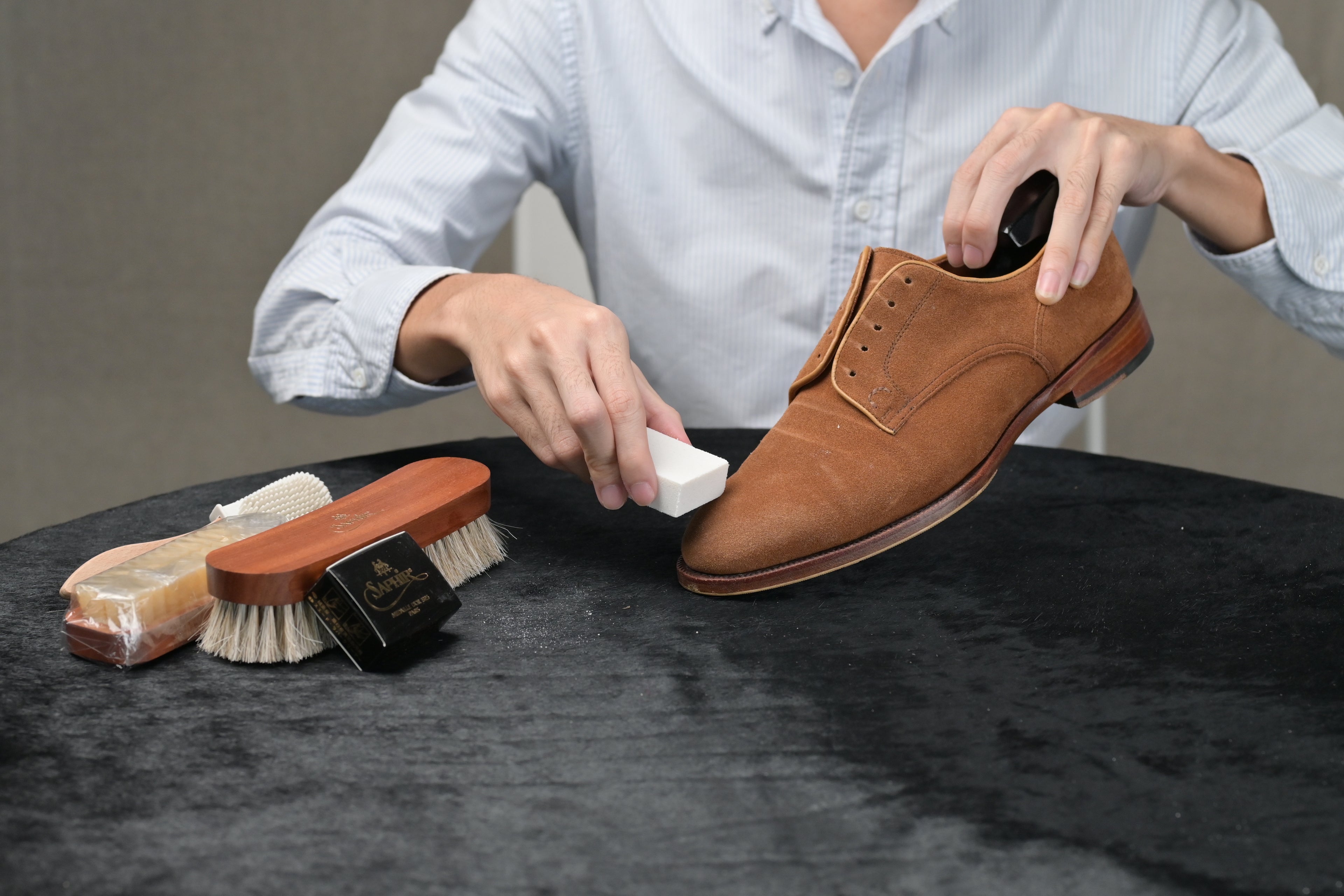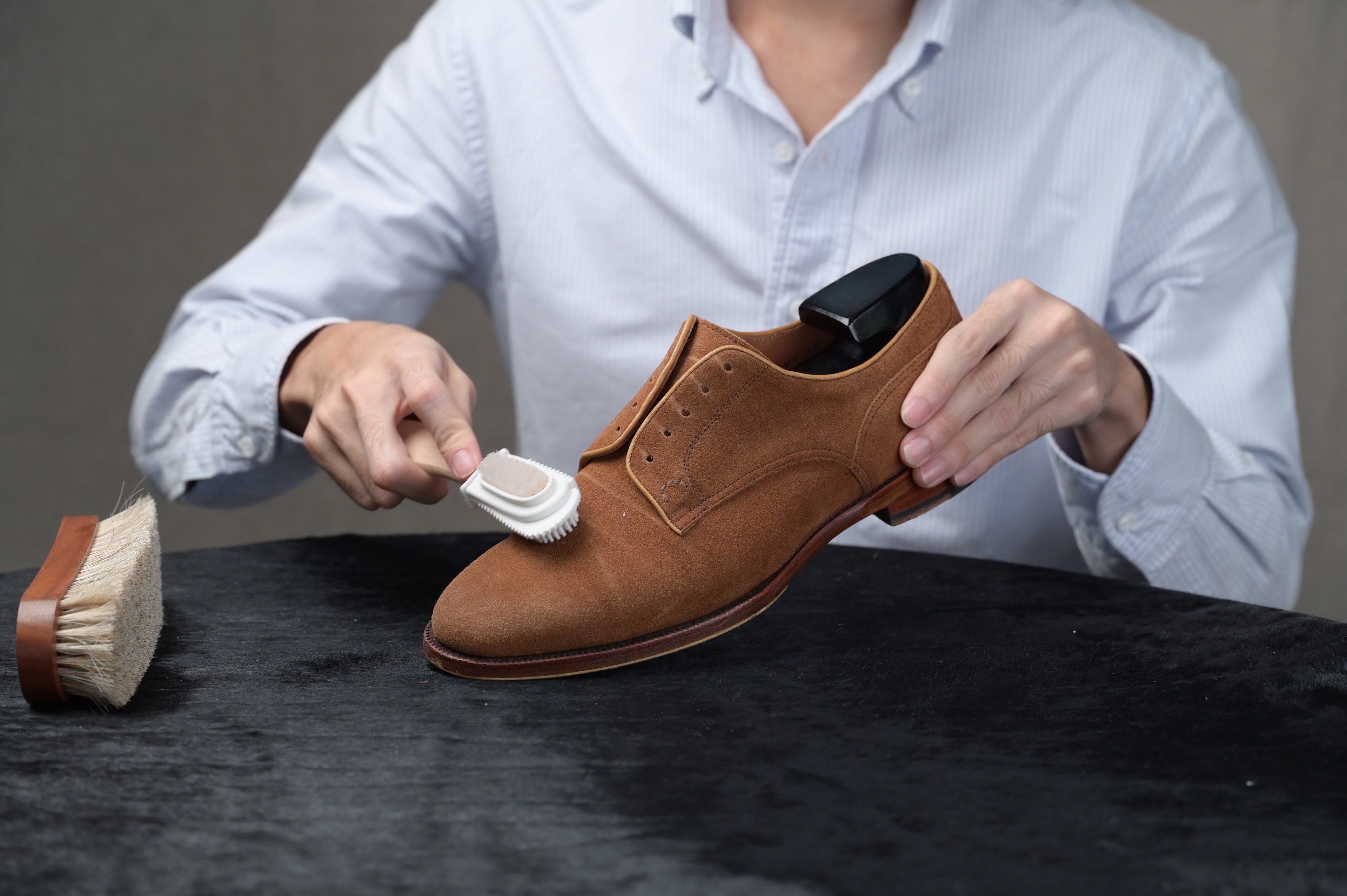 If there are any specific stains or any other stubborn stains on the shoes where the suede brush is unable to remove, proceed to use the Saphir Gommadin Eraser. Once you have identified the dried mark or stain, rub the eraser onto it like how you would do with a pencil eraser. Afterwards, brush off any residues or grime with a horsehair brush.