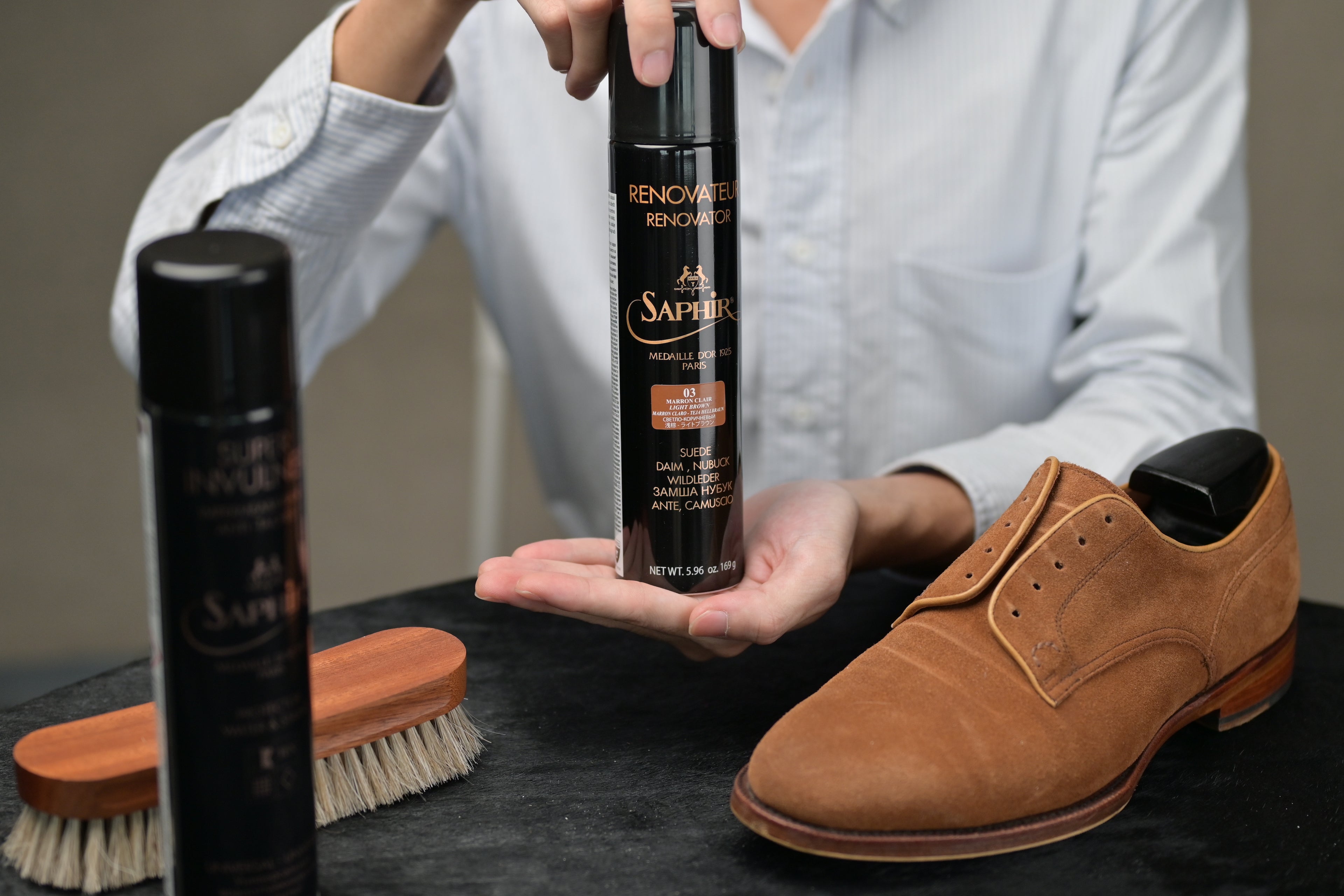 We recommend using the Saphir Médaille d’Or Suede Renovateur to nourish and recolour your suede or nubuck leather shoes especially if the colour has faded after using The Omni’Nettoyant.